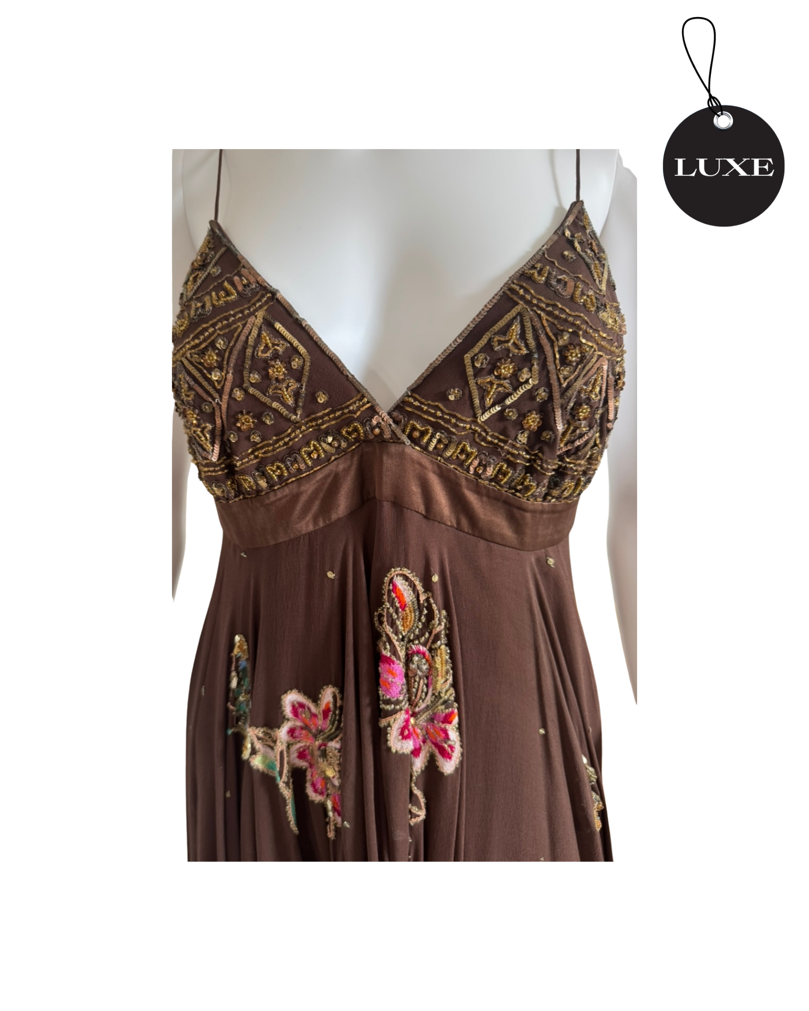 This brown cocktail dress is crafted from 100% silk, the Matthew Williamson Cocktail Dress combines luxurious fabric with exquisite embellishments for a standout look. Its refined silhouette and detailed decoration create an elegant statement perfect for evening occasions, ensuring comfort and sophistication in one piece.
