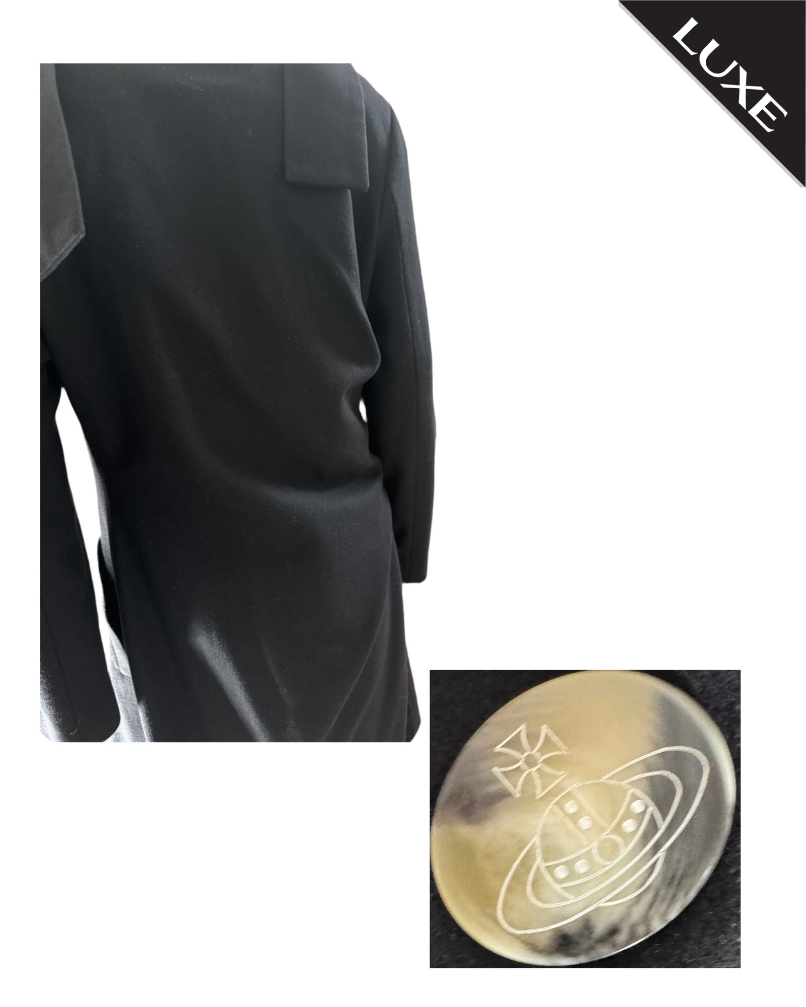 This authentic Vivienne Westwood Red label coat is expertly crafted from luxurious wool and cashmere blend. Mid length overcoat has a stylish in built scarf feature and cinched in waist in classic Westwood styling. The coat has branded buttons closure and is lined. It has been gently worn but is still in excellent condition.